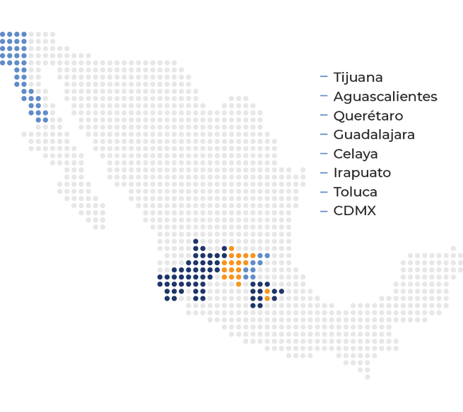 Nuestras gerencias regionales se encuentran ubicadas estratégicamente en los territorios centro, bajío y occidente del país. Contamos con cobertura en diferentes entidades federativas y oficinas municipales bajo las exigencias y necesidades de nuestros aliados comerciales.